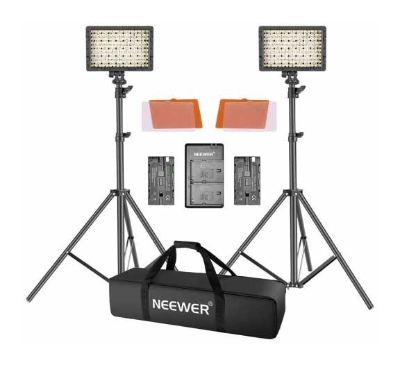 Each light has a shoe mount or 1/4-inch thread for mounting on tripods and light stands. The lights are battery operated only, for portability and location work: the included 8 batteries can keep the lights running all day (during shooting) and the included chargers can charge them up for the next day in just a few hours.